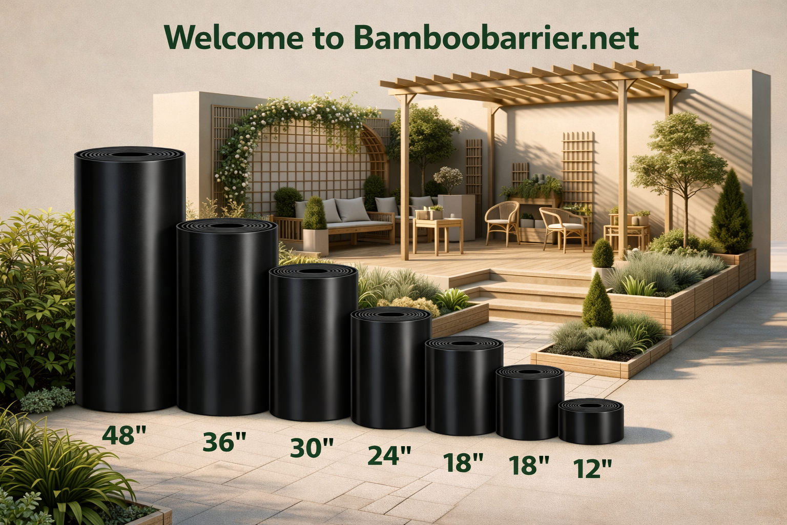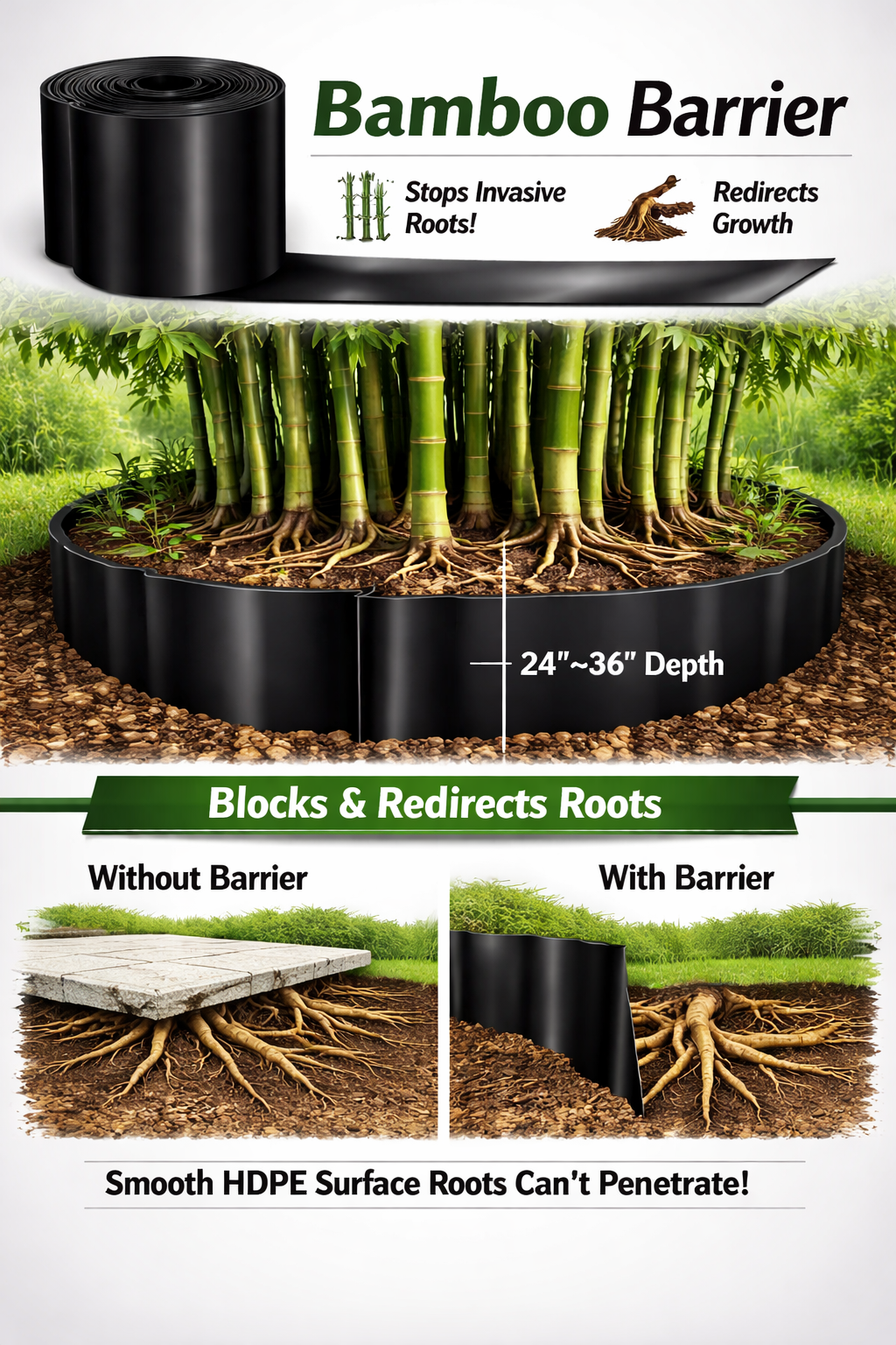 Bamboo Barrier: Specifically engineered to withstand the intense pressure of spreading rhizomes. We offer high-density polyethylene (HDPE) rolls in various thicknesses and lengths (up to 300 feet per a roll ) to create a seamless containment zone.
